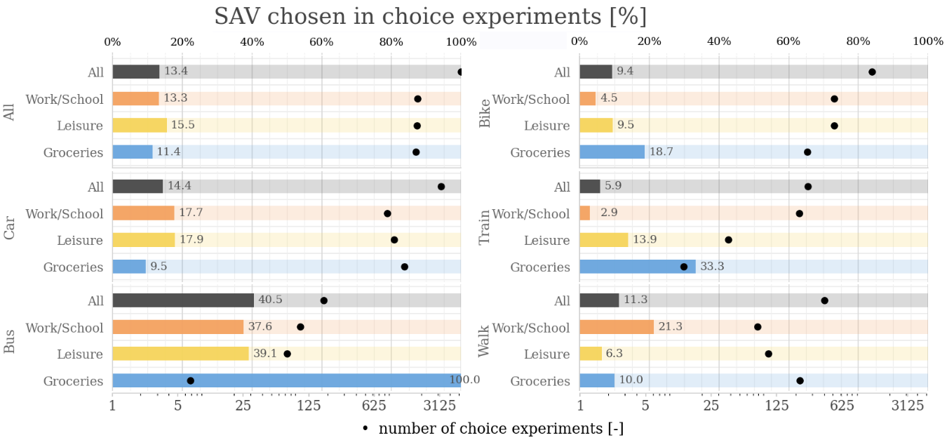Methodologically, the project combines a large-scale stated choice experiment (652 respondents, nearly 5,000 binary observations) with advanced discrete choice modeling, including Multinomial Logit (MNL), Nested Logit (NL), and Cross-Nested Logit (CNL) formulations. The use of cross-nested structures enabled rigorous identification of substitution patterns and latent similarity between the proposed AV service and conventional modes. The modeling framework formally derived and estimated correlation structures in unobserved utility components, quantified substitution strength, and estimated value of travel time (VTT) across trip purposes. This level of structural modeling, combined with experimental design grounded in revealed reference trips, demonstrates the ability to move beyond surface-level prediction toward behaviorally interpretable, statistically robust, and policy-relevant inference (Transportation Research Board 103rd Annual Meeting - 2024 & European Transport Research Review - 2025).