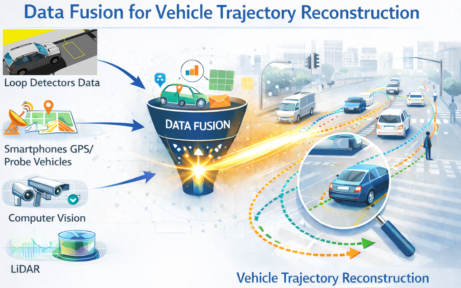 I introduced two data fusion and large-scale data mining methods that enable the approximation of vehicle trajectories, including lane-changing maneuvers, using conventional roadside sensor data at near-zero additional cost. These methods leverage individual vehicle cross-sectional observations and reconstruct continuous trajectories over extended spatial and temporal horizons.
