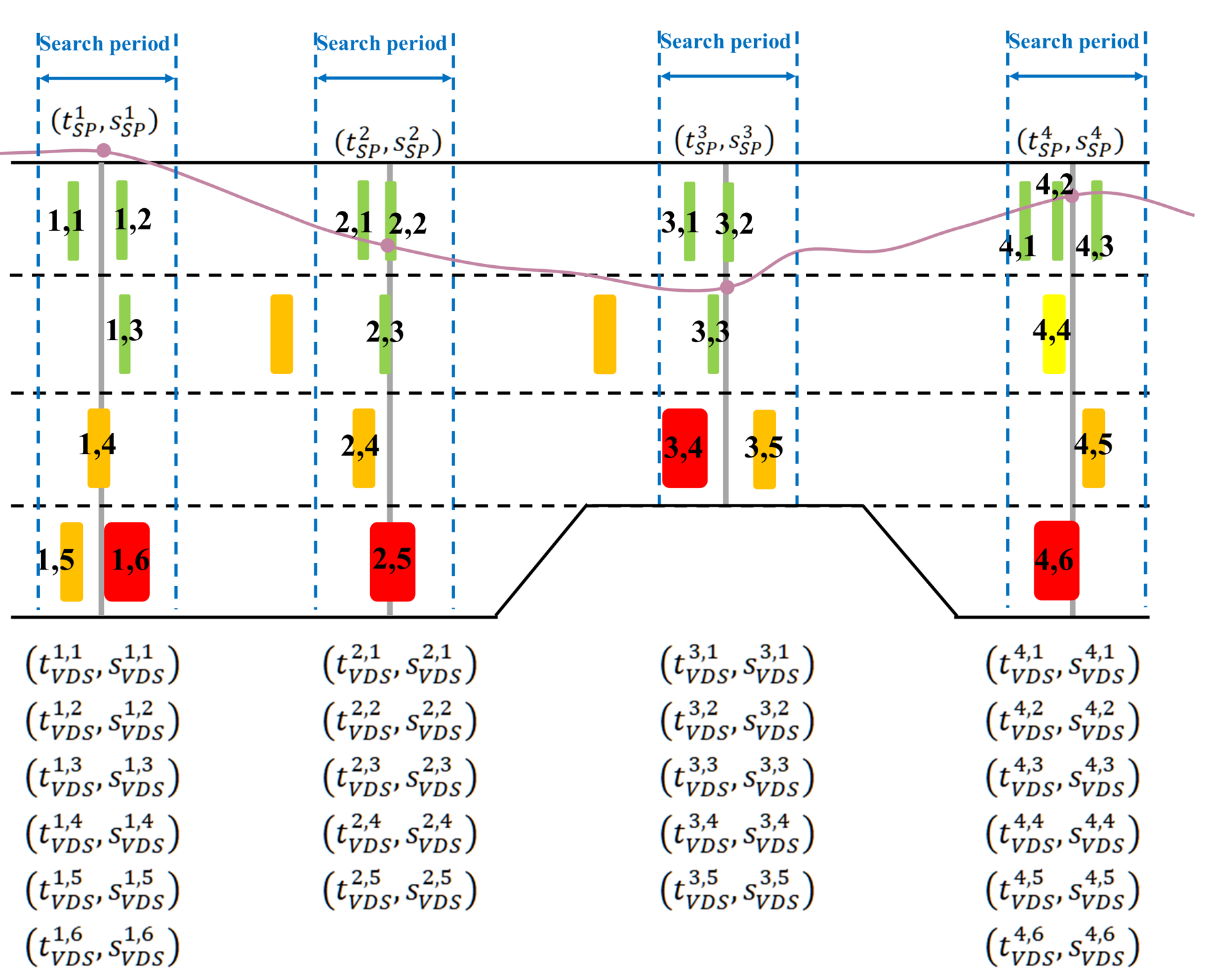 The data fusion logic: Floating-car trajectories are corrected by anchoring them to lane-specific loop-detector detections within time-consistent search windows.