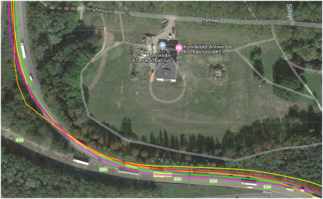 The green line represents the trajectory of a probe vehicle collected using a centimeter-accuracy d-GPS; the other lines represent the same probe vehicle's trajectories collected simultaneously by several smartphones in that car.