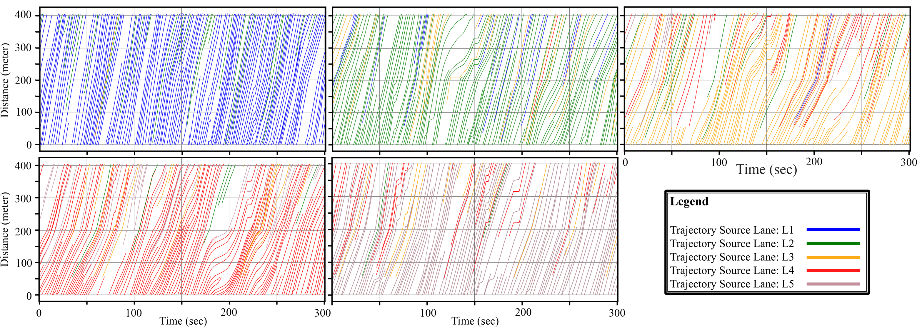 A sample of resulting trajectories: 5 minutes and 400 meters, including lane changes.